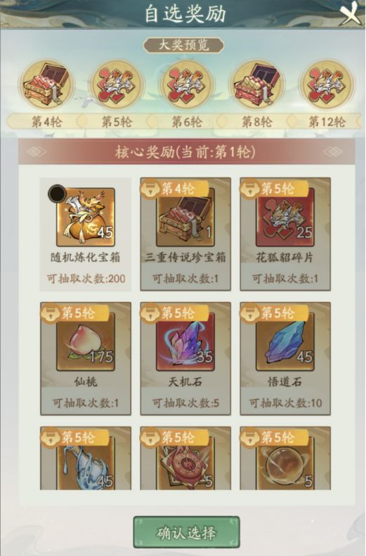 在进行每轮妖塔探索时,道友可以选择该轮心仪的奖励。奖励会随着轮次的增加解锁更加丰富奖励。