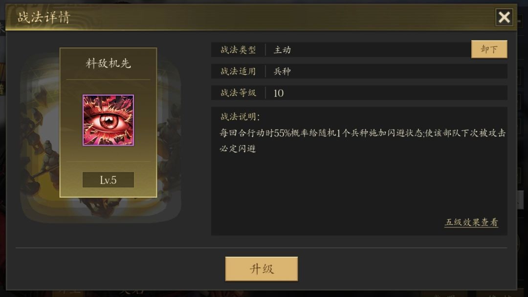 四,料敌机先。这个技能的满级状态,每回合有高达55%的概率让己方部队闪避掉敌军打出的伤害,堪称保命神技。