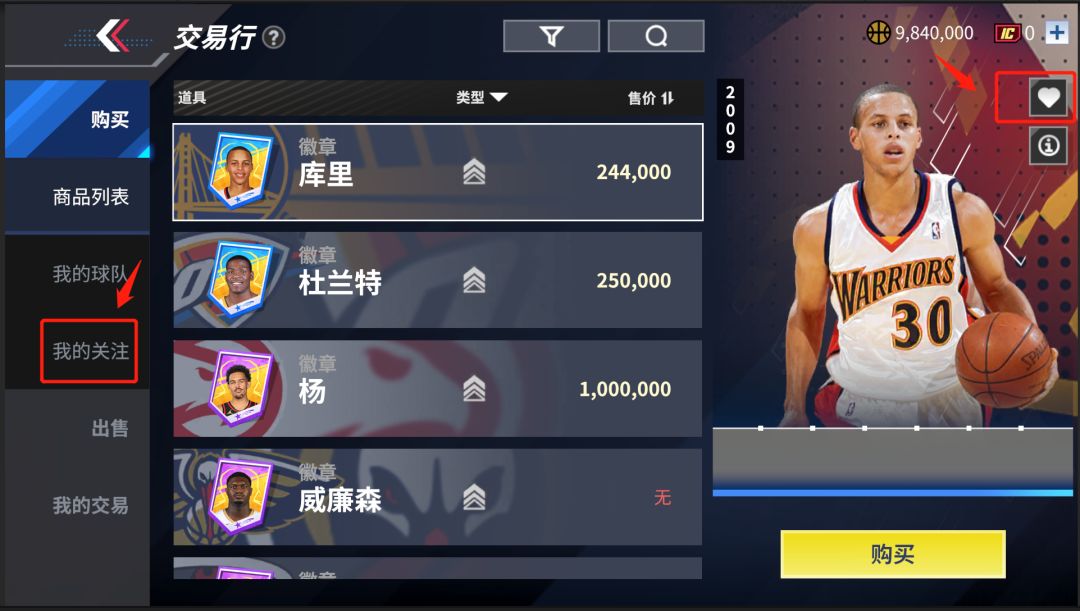 1.玩家在购买页面可以点击自己感兴趣的球员右侧的“爱心icon”添加到我的关注中,便于后续随时跟踪该球员徽章价格变动与市场存量;