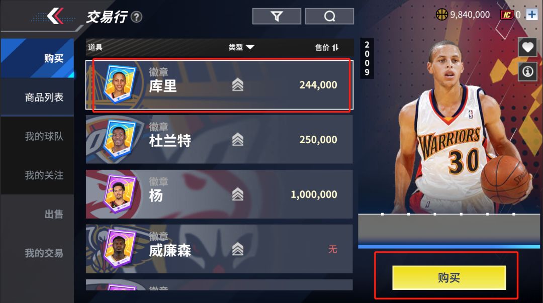 ②打开交易行界面,可以浏览当前上架的球员徽章列表。选择自己所需的徽章,点击购买并确认支付金币,即可完成交易获得球员徽章;