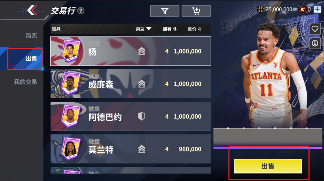 ④出售球员徽章时可以点击下图icon进入批量出售页面,选中不同球员后可以同时上架出售他们的球员徽章,提高上架效率。