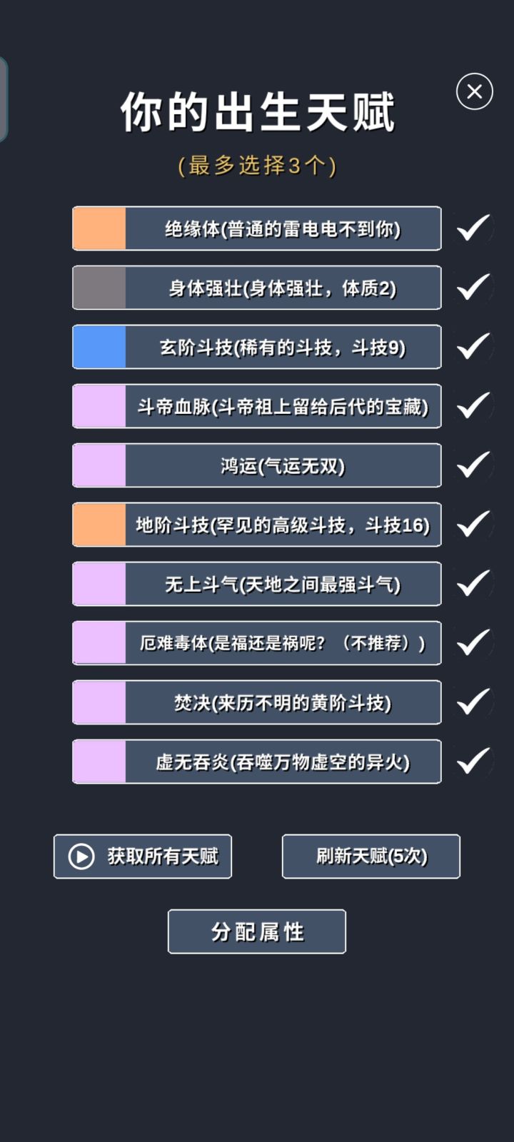 前中后期厄难毒体无敌,然后是斗帝血脉和无上斗气,还要无双气运,配毒体,无上斗气气运就行了,其他无所谓的,那个焚决要带虚无吞炎才能吞异火,不然容易死,对了我加点2,10,4,毒体开局必掉4体质提升修为,只打坐,买药吃提修为是其他的十倍,难绷,后面差距更大