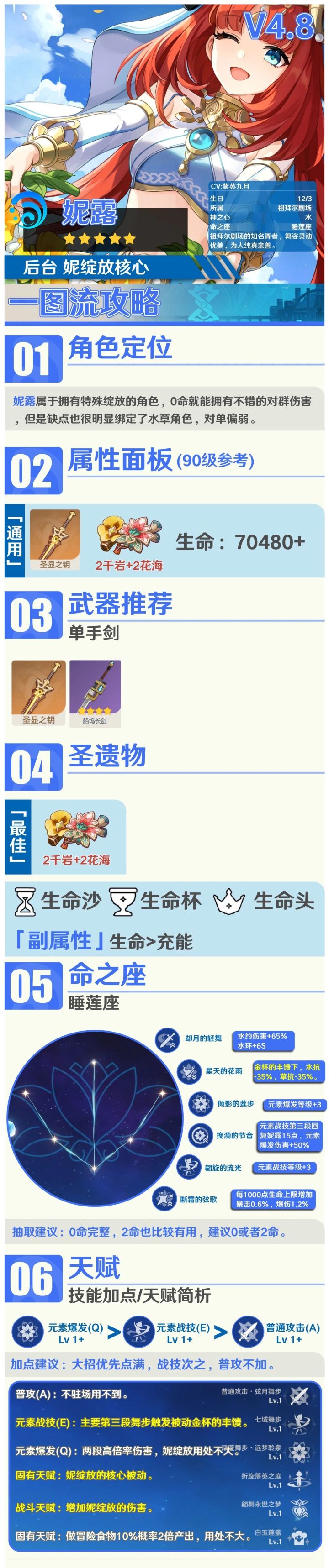 4.8的剧情中,我们的老朋友妮露作为关键人物参与了这次的故事,还在剧情的一开始就给了我们一个大大的拥抱,真的太吸粉了,作为原神在3.0时代的对群天花板,妮露现在要怎么培养呢?一起看看吧~
