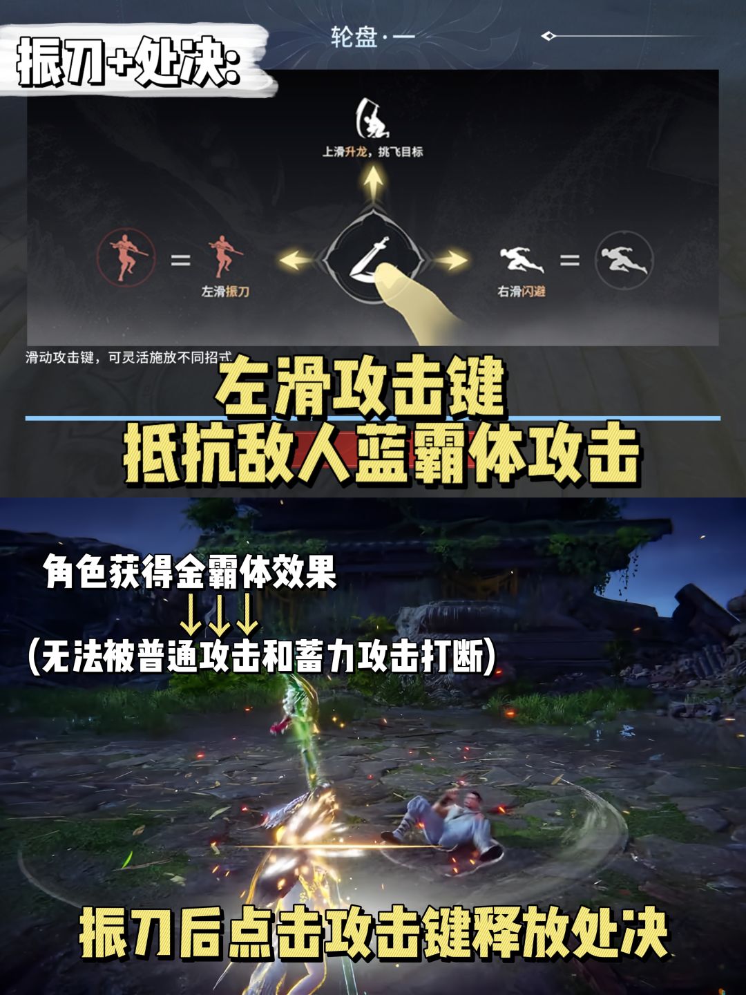 (角色红光),当敌方蓄力攻击(蓝色状态)打到你的振刀架势上,此时,振刀成功,敌方武器掉落,你的角色变为金色,再点按攻击键可触发处决攻击(高额伤害)