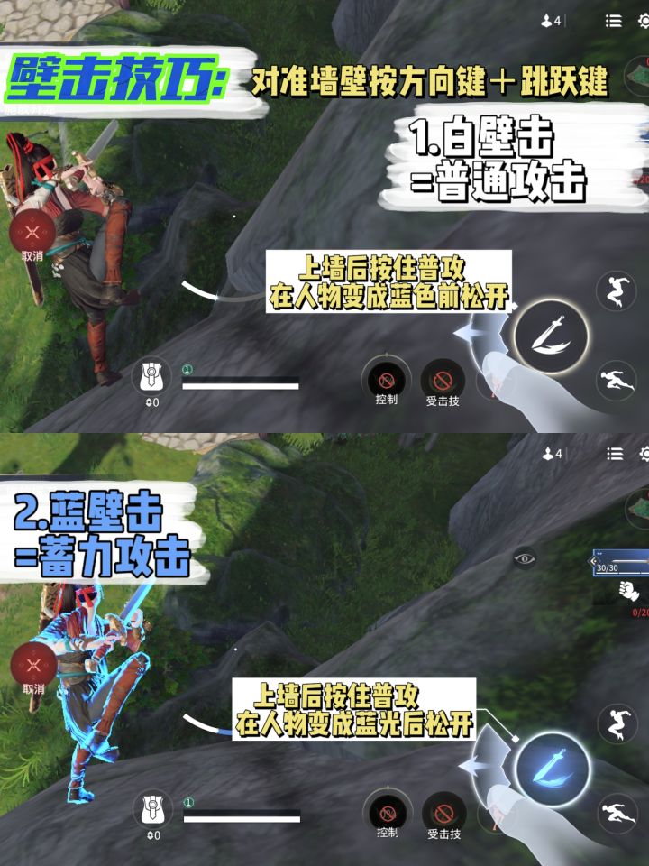 当角色在墙上可按住攻击键蓄力释放远距离突进的攻击,根据蓄力时间分为普通壁击(白刀)和蓄力壁击(蓝刀)