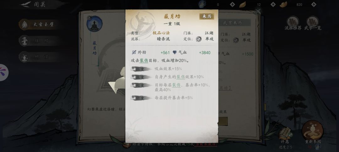 此为理论,暂未实验,我藏月缺心法太多了,只能藏紫6。七重之前他只给你加了5%的连击概率,对我来说感觉可有可无,我甚至不如把一个连招换成狂风去打一个伤buff,然后去吸血,t前排,主角站侧位,叠素心buff。听雪拉条,狂风补buff,神门连招多,5素心35%闪避,40%暴击,这个暴率我感觉他指的应该不是暴击率,而是在你原本的暴击上去加了这个数值,35%的闪避,我只要闪一次我就赚,我只要打出一次连招吸血我更赚。闪避之后打了吸血我更赚,因为我狂风都是直接全部丢给太阳,所以我主角并没有上狂风这个功法,但是就我这样的配置,我去刷45,差点过了,没有过的原因,只是太阳没了,补不上那个裂伤buff,这只是一种邪门的偏路,兄弟们感兴趣可以试一试,具体原因只是因为逍遥游给的那5%概率太低了,我还不如不要![[表情_捂脸哭]](https://img-tc.tapimg.com/market/images/83aa452eea88b5c64df710bca367b7e9.png)