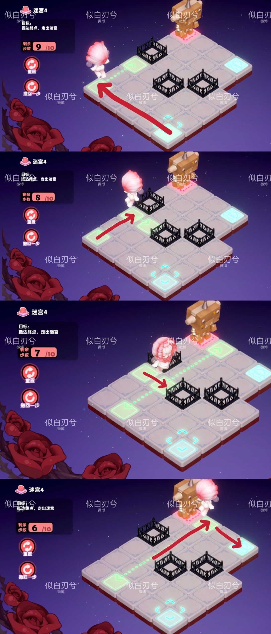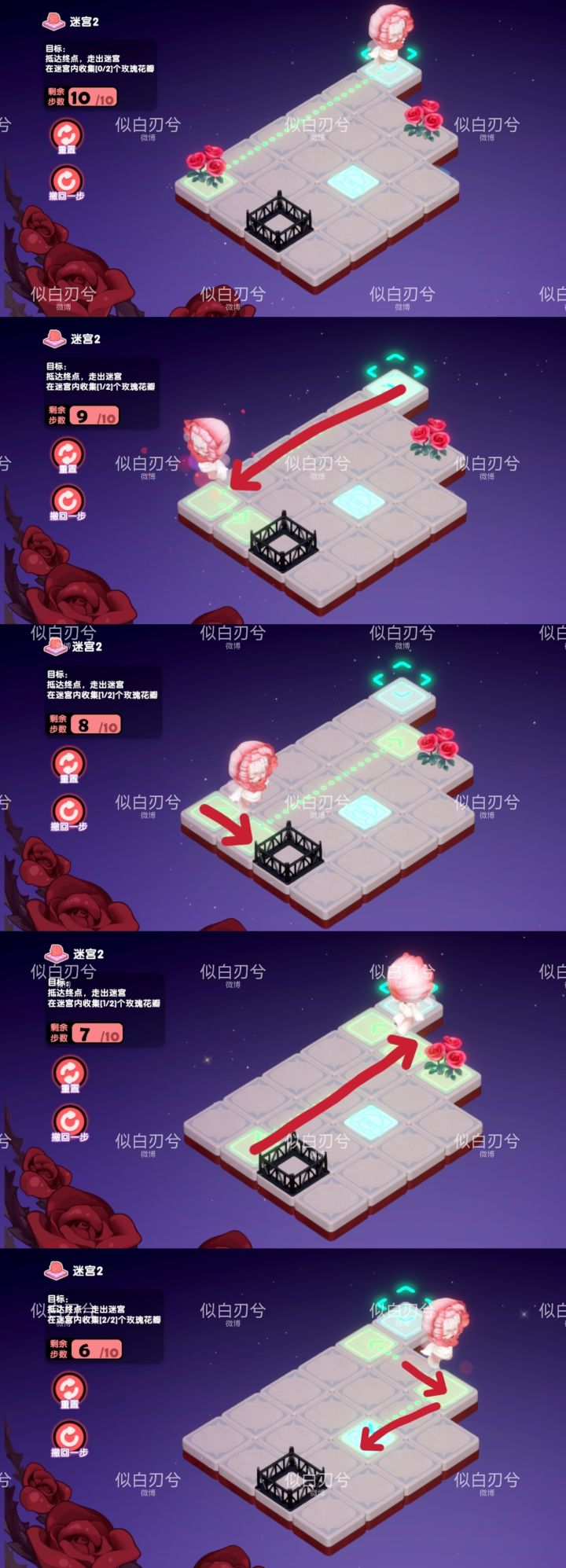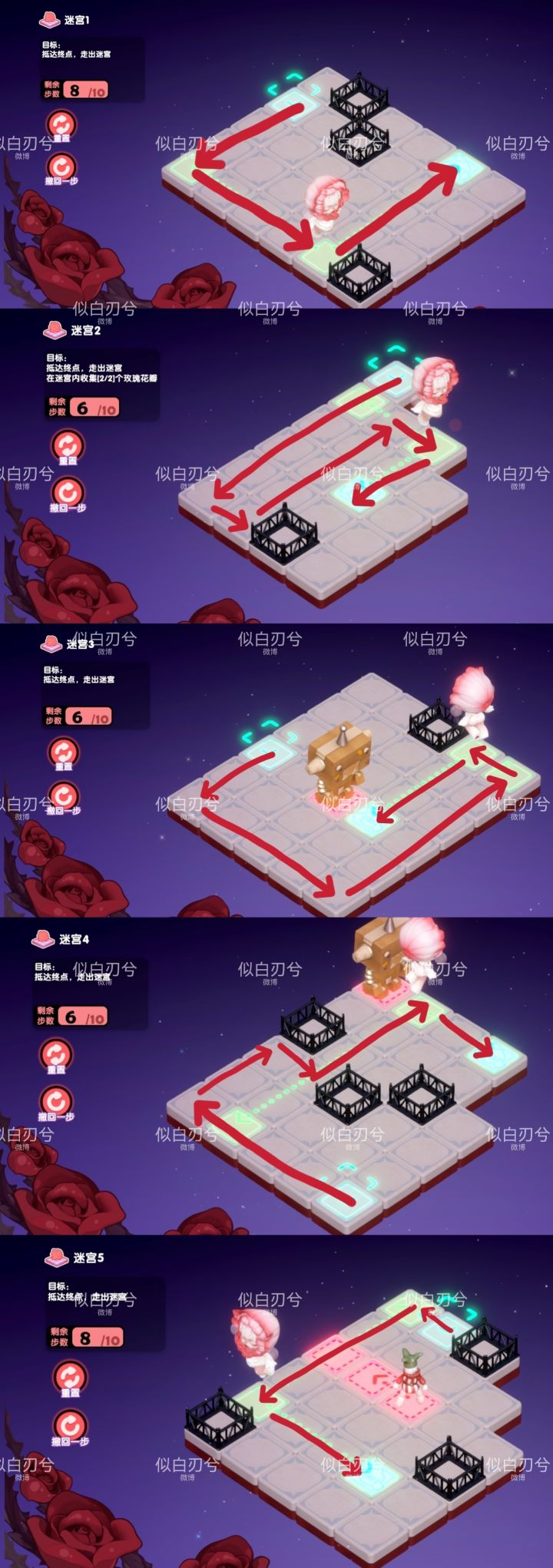 惊奇古堡迷夜花庭活动游戏 :迷宫初探走法(走步顺序不唯一,有其他走法能过关就行)第二张是这五个关卡按顺序的图解,后面几张是从第二关开始的分解步骤走法