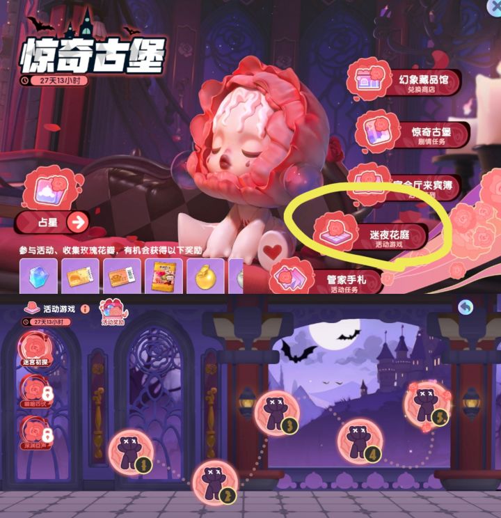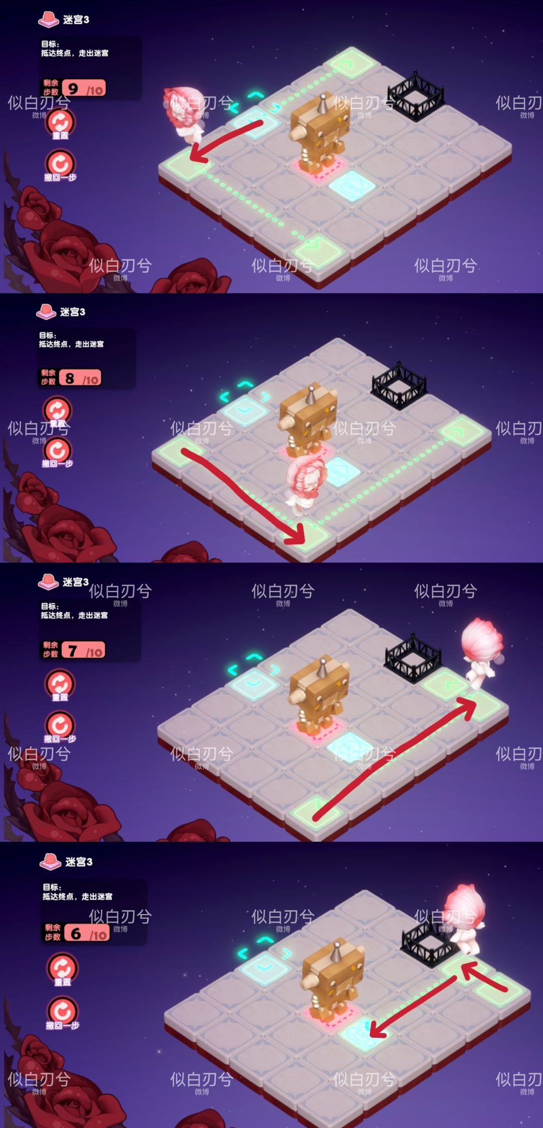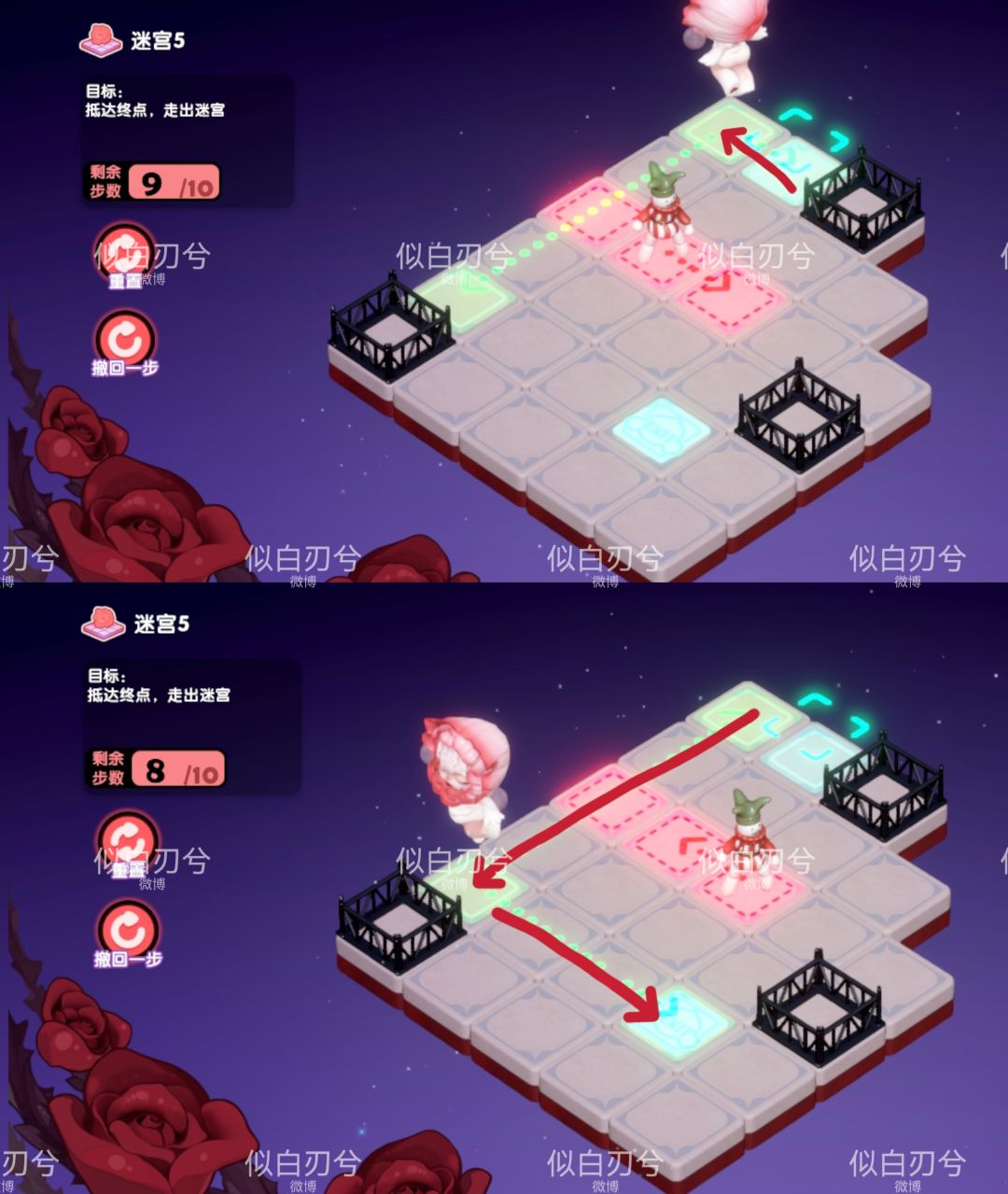惊奇古堡迷夜花庭活动游戏 :迷宫初探走法(走步顺序不唯一,有其他走法能过关就行)第二张是这五个关卡按顺序的图解,后面几张是从第二关开始的分解步骤走法