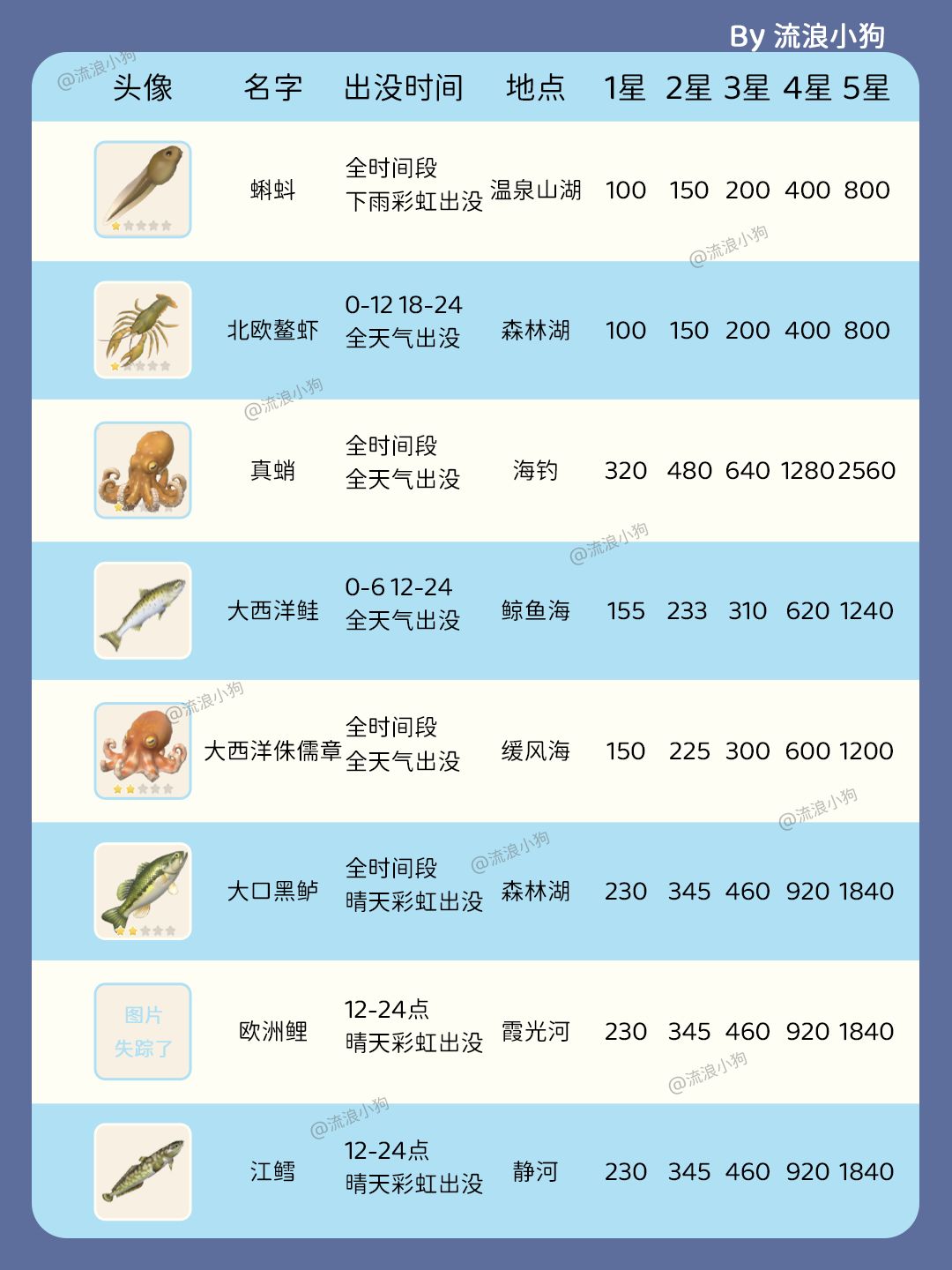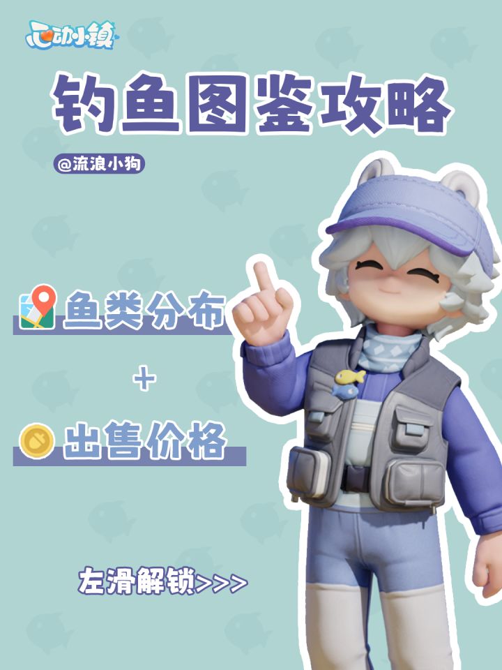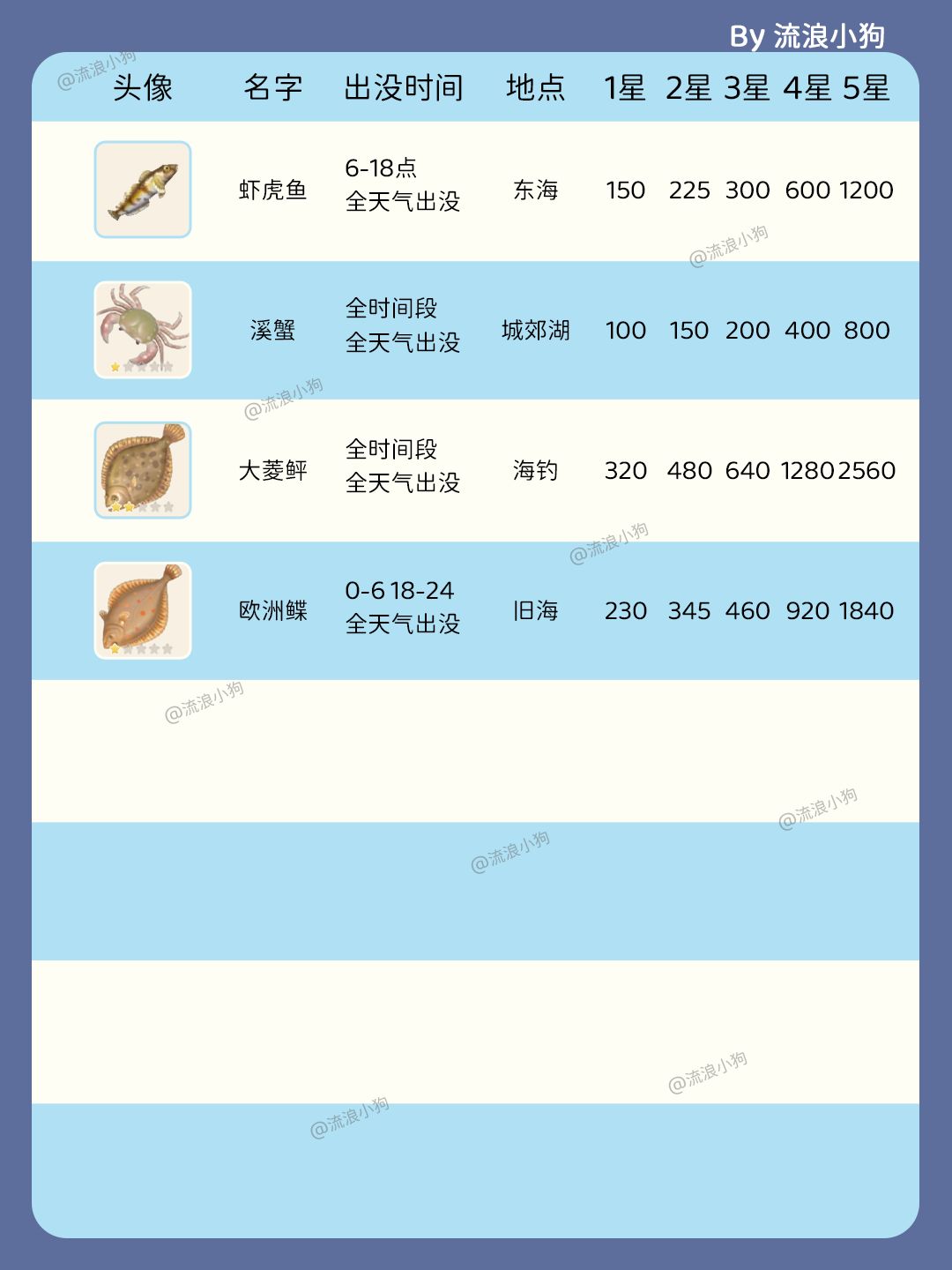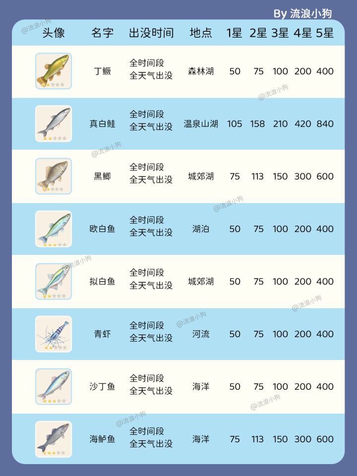 钓鱼爱好者看过来啦,“流浪小狗”为小镇居民们整理了鱼类图鉴、出没时间、钓鱼点位置、以及出售价格。
