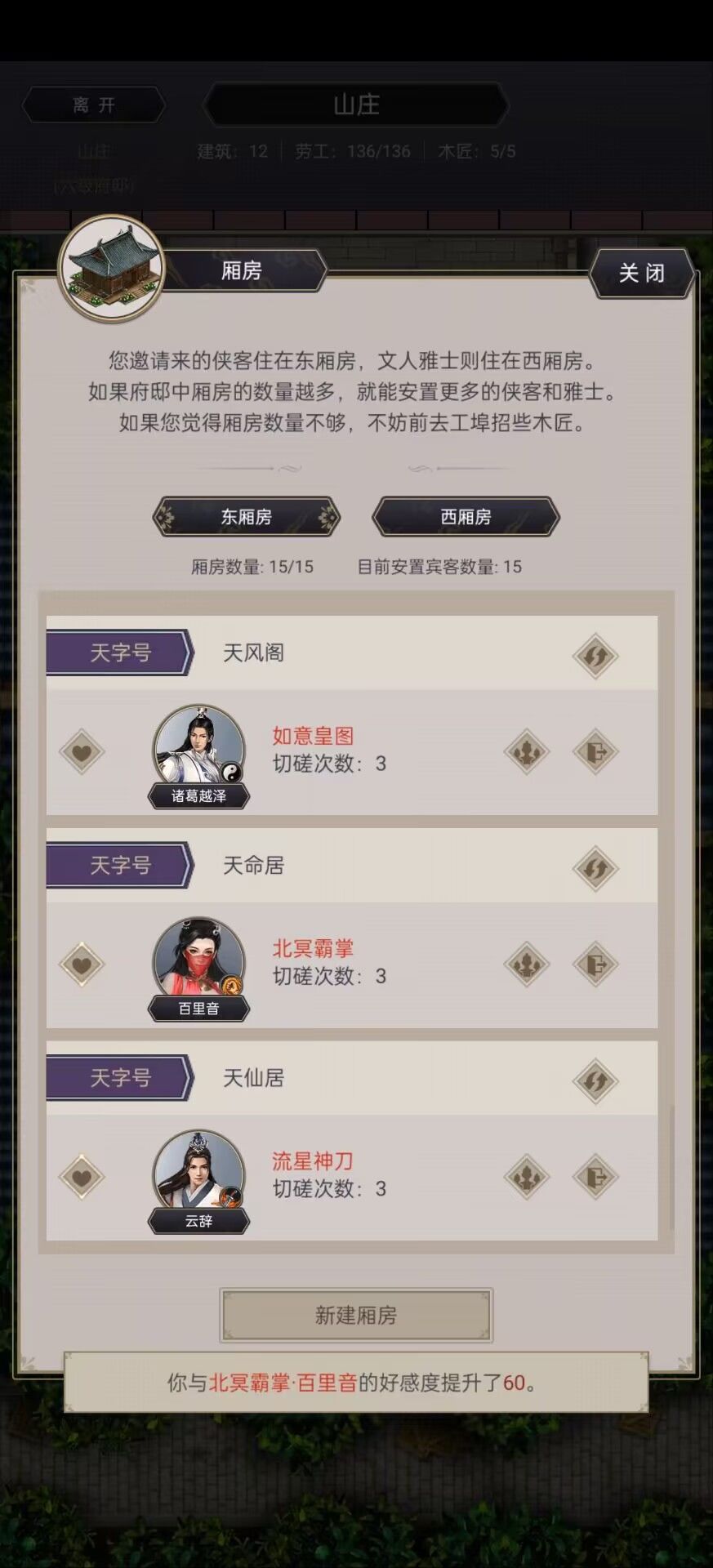 最后,关于家园装饰,先不说招财猫,因为这个主要是依靠三仙归洞的方式获取。然而,众所周知这就是江湖又名丹药江湖,能够增加爆丹几率的老子永远都是装饰的第一选择;其次,本游戏有大量优质的书房武学,书房武学的熟练度主要也是依靠文人烧香来获取。书房收藏的藏书又与本游戏一个重要的属性来源四艺有关,无论是前期还是中期还是后期,能够将四艺全部拉满达到200级的人绝不是很多。那么与书房随从的烧香便是一个重要的内力/四艺熟练度/书房武学获取及熟练度的来源方式。文人的厢房需求相对侠客也较少,只需要天地人各四间房子即可。当然,文人的获取方式更是比红侠客的获取简单的太多,只需要按照江湖小数据的相关方式并熟练运用听歌识曲的方式即可轻松获得12位文人。