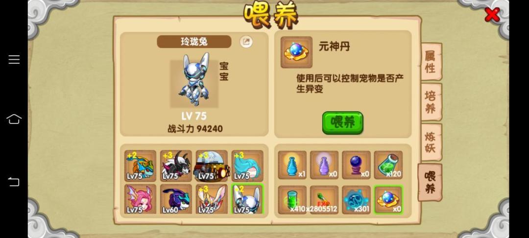 喂养界面可以查看所有与宠物相关的药剂,相信各位都比较清楚各种药剂的作用了,我就简单解释一下这个元神丹。它只能保证让你的宠物不发生异变,但是并不能保证宠物一定异变。也就是说,这玩意没啥用的,宠物该不异变还是不会变,虽然现在已经基本绝迹了,但是星之礼包里还是可以开出来的。