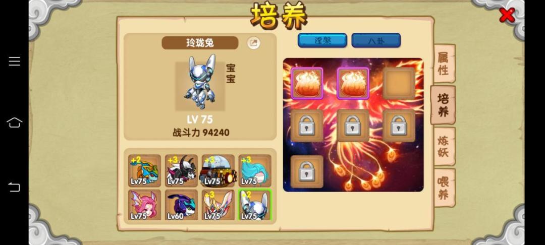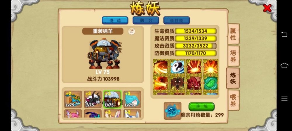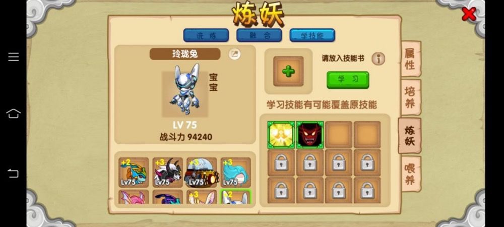 然后是炼妖界面,分为洗练,融合,学技能3个板块。