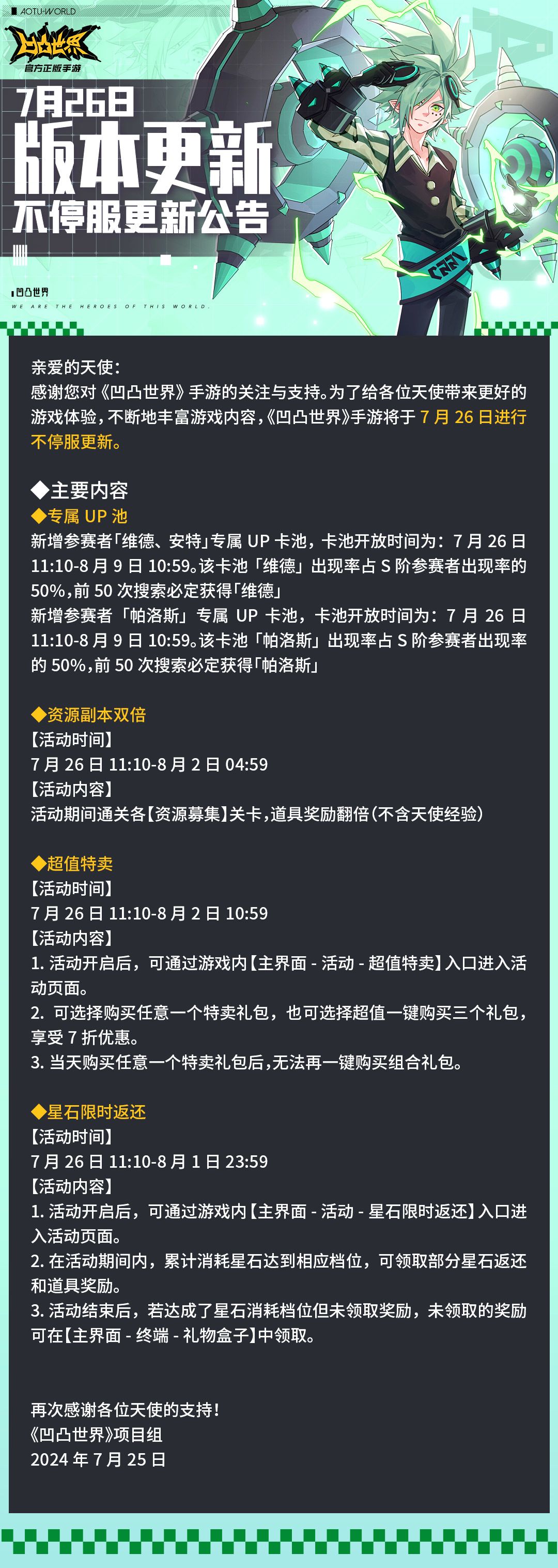《凹凸世界》手游将于7月26日进行版本不停服更新。