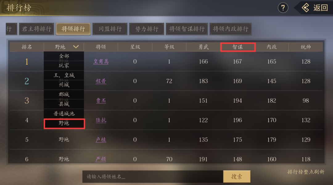 首先是在野地里的将领,这是前期最容易抓的将领。首先我们可以点开排行榜选择将领排行,筛选出在野地里的将领,然后将属性降序排列,选择高属性的将领。选择将领在客栈里进行寻访,然后前往对应的坐标对其进行攻占。注意将领的忠诚度要低于50才有概率抓捕,所以一般在野地的将领很大几率会逃跑,逃跑以后需要再次在客栈里寻访将领的坐标位置(一般需要5、6次的攻占)。