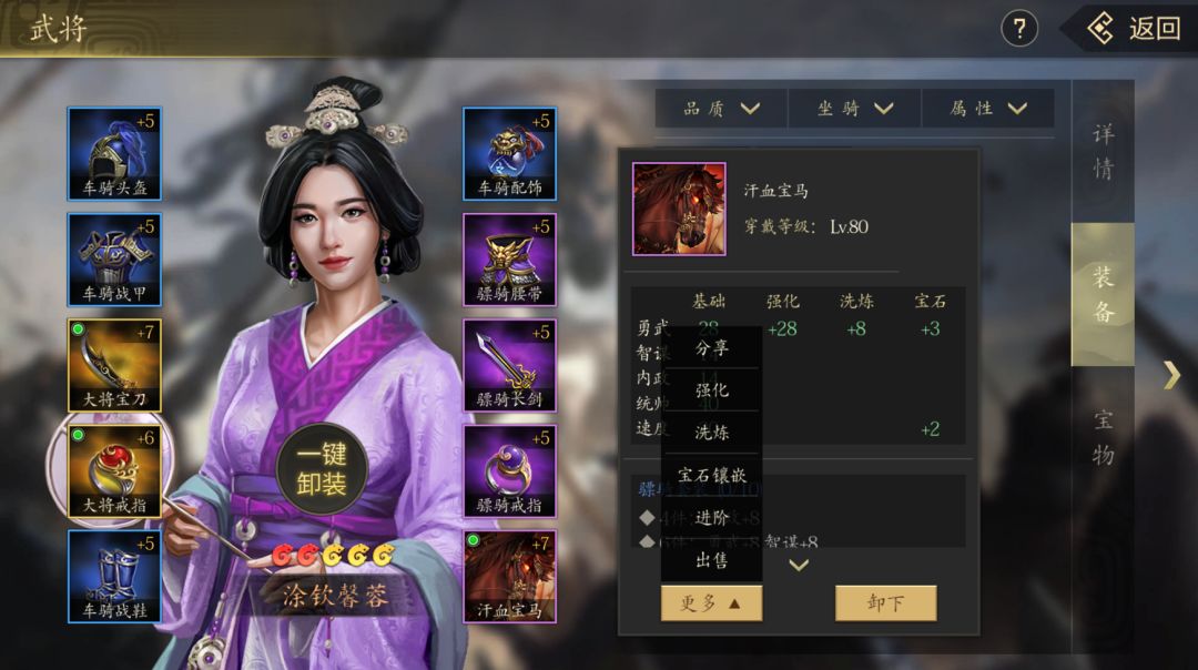然后是名将的培养,名将可以通过升星、装备提升、经验书提升四维的数据。但与君主将不同的是,名将可以通过战斗获得经验,并且将领通过消耗洗髓丹将已分配的潜力点重置;将领首次洗点则会将三维(勇武、内政、智谋)的部分属性重置为潜力点,将领的品质越高洗点需要的洗髓丹数量越多。