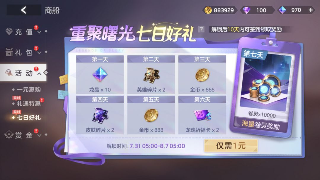 仅需1元即可解锁登录好礼,累计登录可获得龙晶、卷灵、龙魂祈福卡、皮肤碎片等奖励