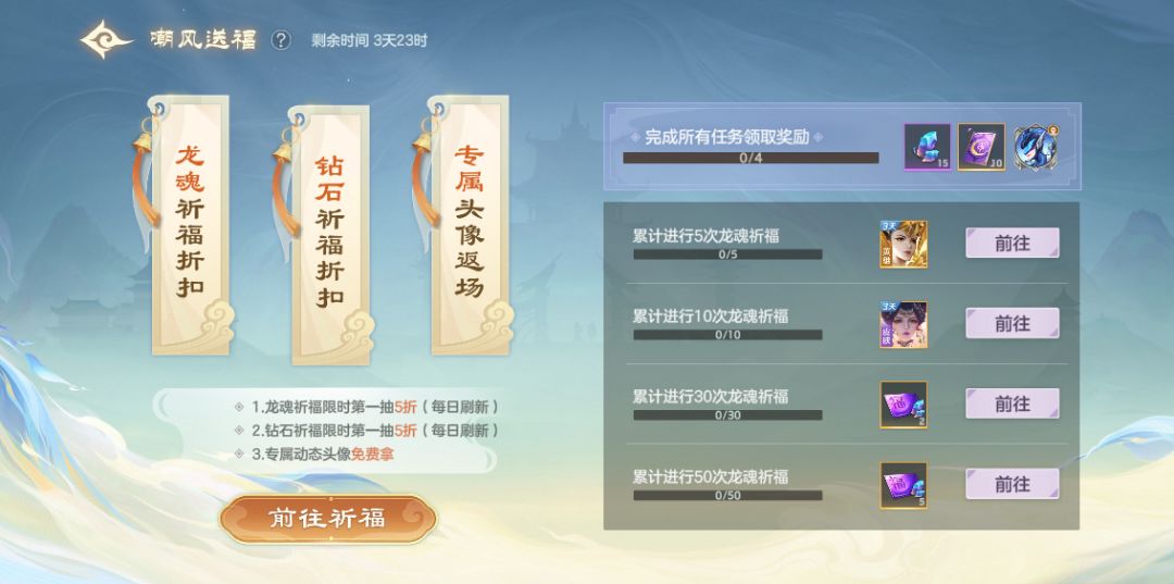 活动期间,完成龙魂祈福任务,可领取英雄体验卡西王母、皮肤体验卡西王母·险檐栖嘲风、龙魂祈福卡,完成所有任务可领取多宝阁抽奖券、头像银河彼端·黄月英、龙魂残片