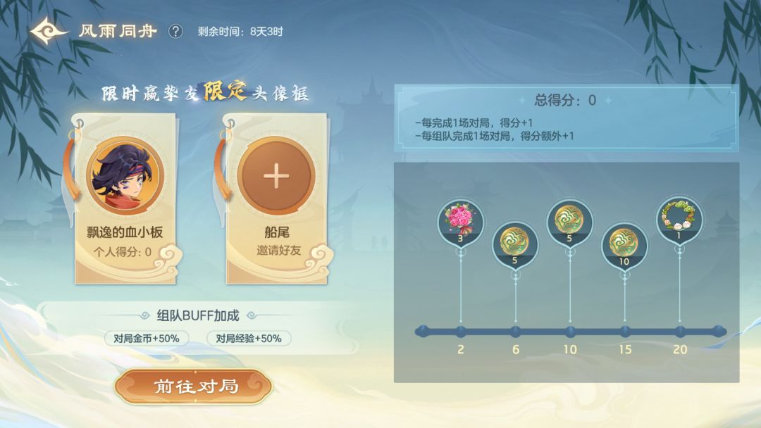 风雨同舟,组队开黑可获得玲珑心、头像框形影不离、浓意之馨等奖励