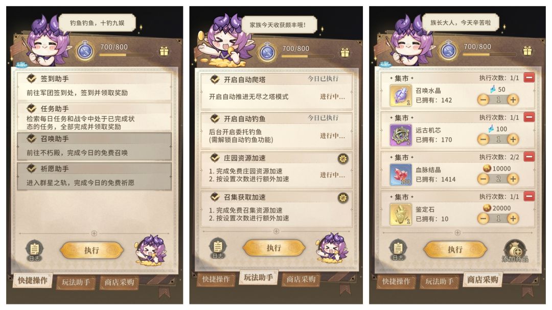 A:收到!我们已经上线了全方位的一键助手,包括快捷操作、玩法助手、商店采购三大功能。“快捷操作”一键执行日常签到、任务以及召唤操作,“玩法助手”帮你一键完成日常养成及战斗,“商店采购”支持一键将商品加入购物车并执行购买清单!贴心的小助手来帮助祖宗大人们,一键解放双手和时间!