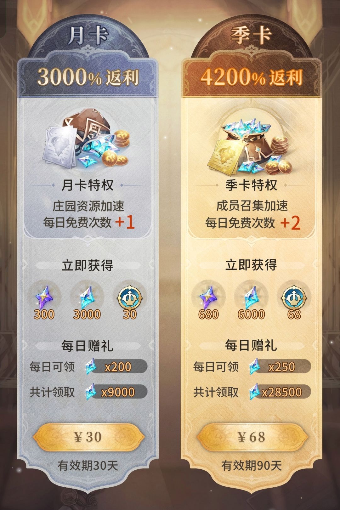 A:收到!月卡、季卡均已增加一次性奖励!购买月卡可一次性获得3000钻石、购买季卡可一次性获得6000钻石,月卡、季卡累计最大有效期为180天。我们也已经根据祖宗大人们购买月卡、季卡的次数补发了相应的钻石数量~