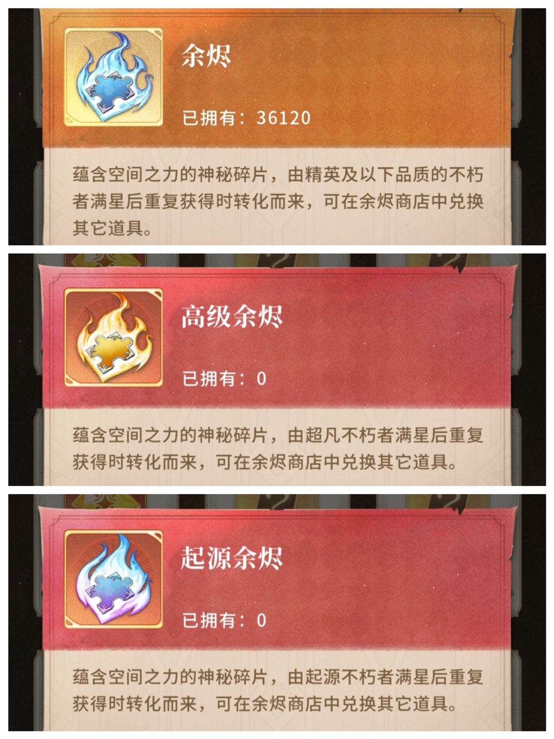 A:收到!我们已经针对性调整了余烬道具!精英不朽者和普通不朽者满星溢出后将转化为余烬道具,超凡不朽者满星溢出后将转化为高级余烬道具。针对此前溢出超凡不朽者的祖宗大人们,我们已经根据当前10星的不朽者数量,补偿了对应数量的高级余烬道具~
