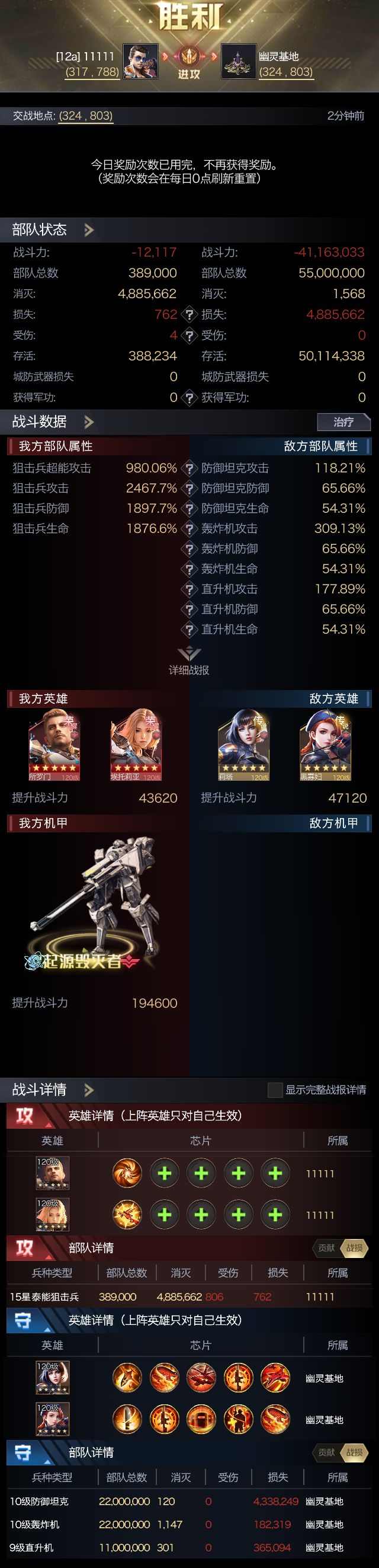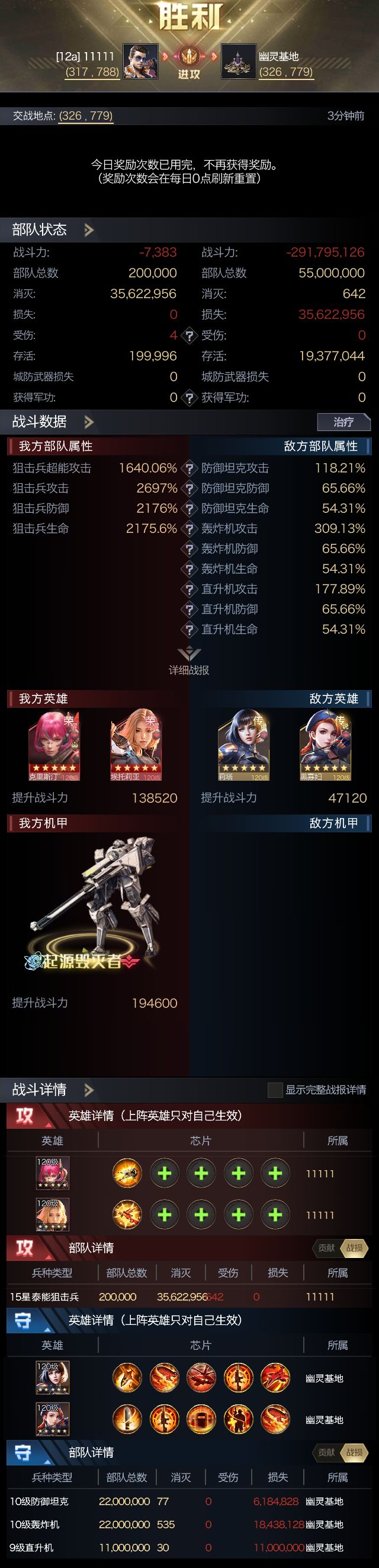 从战报中可以看出,荣耀所罗门搭配埃托利亚消灭敌方战斗力4116万,荣耀克里斯汀搭配埃托利亚消灭敌方战斗力高达2亿9千万,是荣耀所罗门搭配埃托莉亚的7倍,克里斯汀带领的狙击兵输出能力十分强劲。