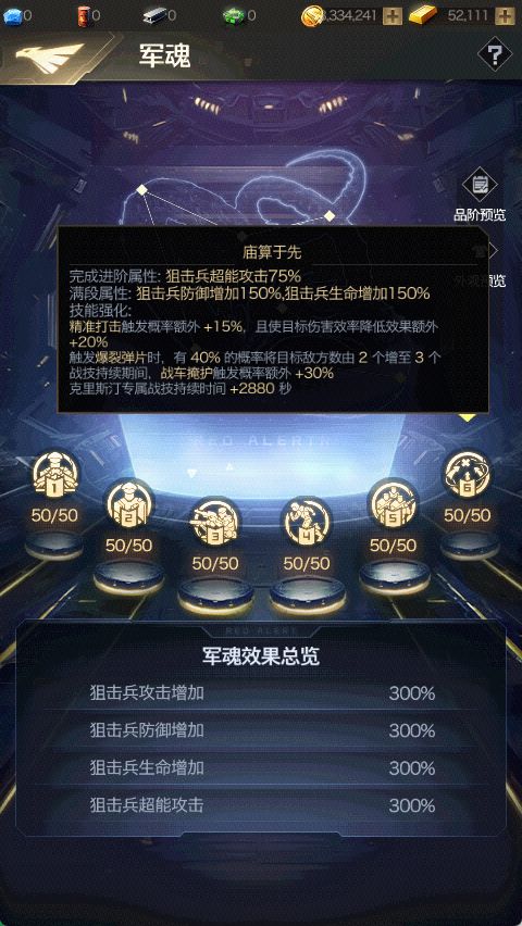 定点猎杀:自身出征数量最多的狙击兵在发起攻击时,有60.00%的概率越过防御坦克,选择敌方最脆弱的单位(生命值越低的单位,被选中的概率越高)进行攻击(伤害率:54.00%)