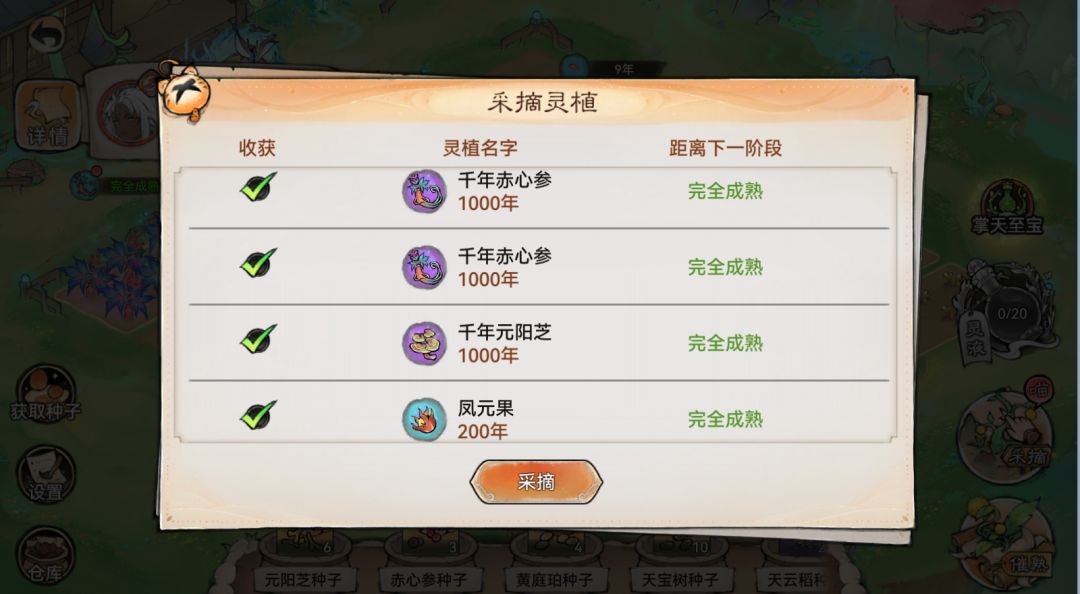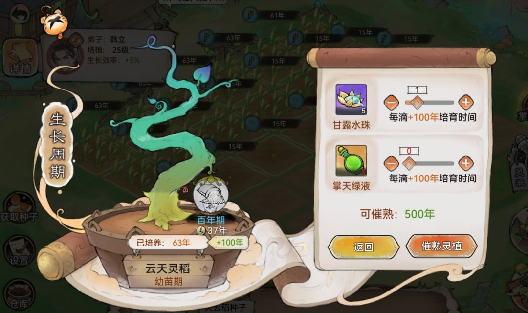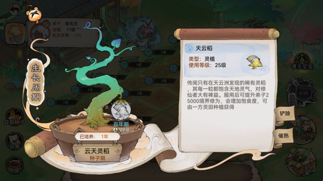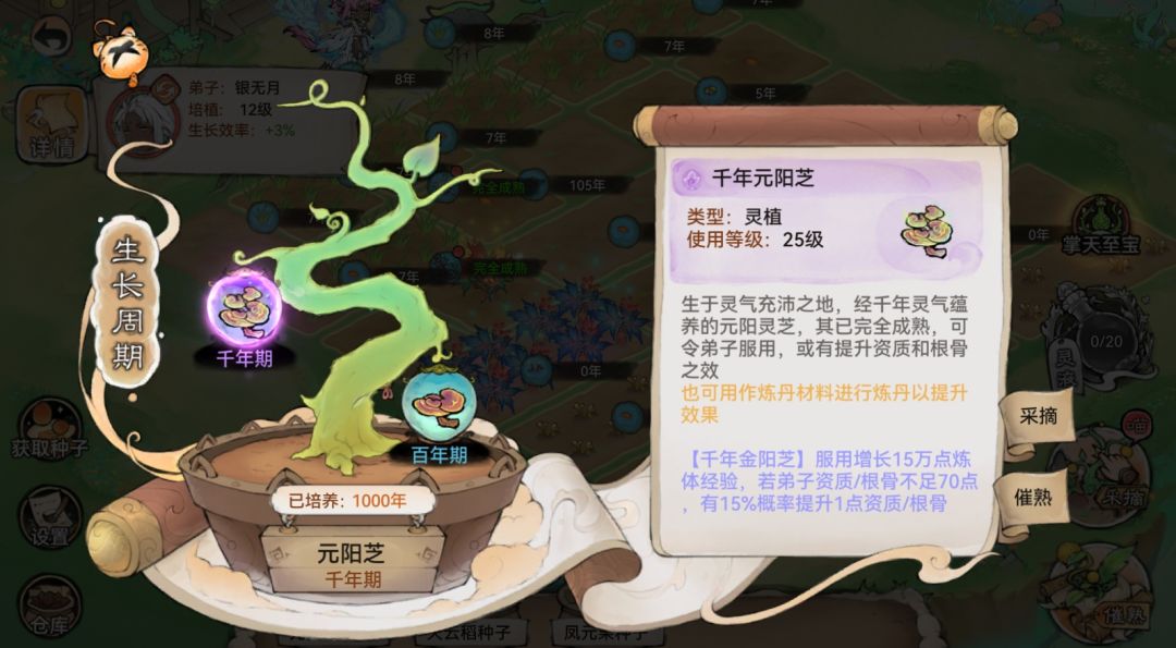 灵植依据生长时间可划分为4个阶段:种子期、幼苗期、百年期、千年期。点击仙圃上还未完达到最高成熟阶段的灵植,可查看灵植成长详情。
