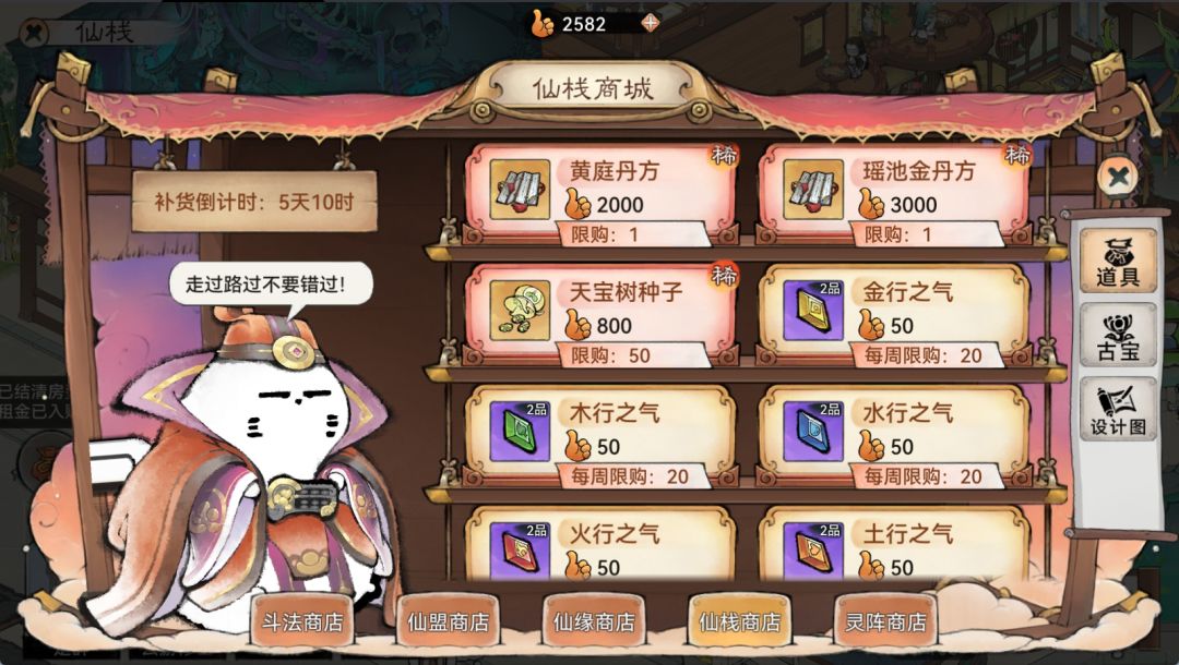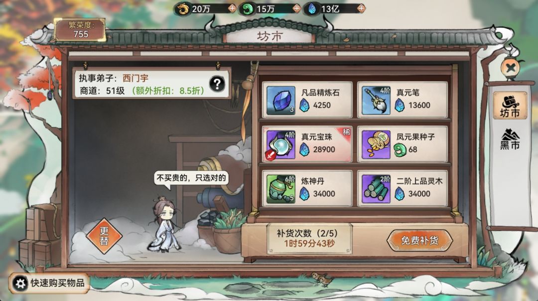 祖师可以前往坊市、黑市、仙栈商店、山海商店购买。值得一提的是,坊市和黑市里售卖种子是概率出现的,又到了看运气的时候啦,记得每天多刷新看看哦。