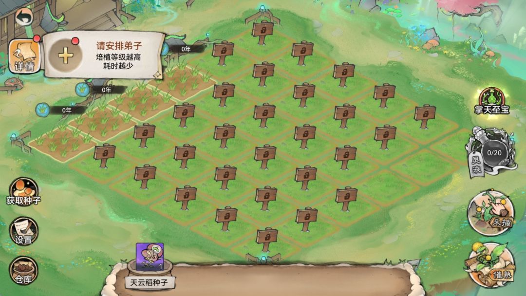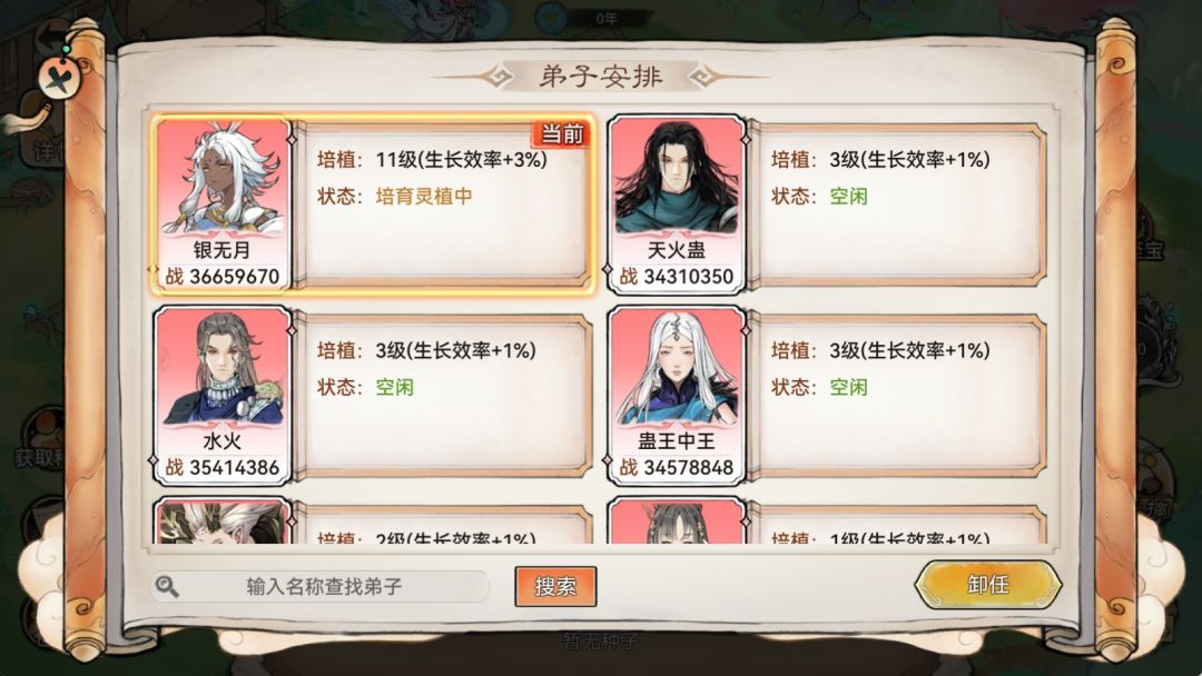 开辟好仙圃,祖师需安排1名弟子进行培植,小清瑶这边建议选择培植等级高的弟子,培植等级越高灵植生长耗时越少哦。