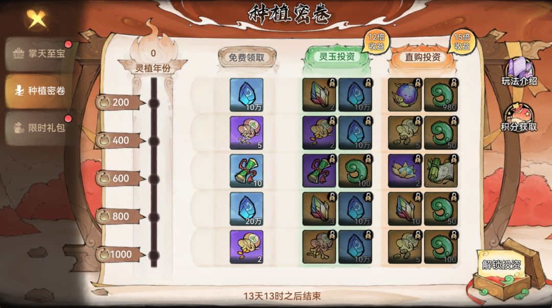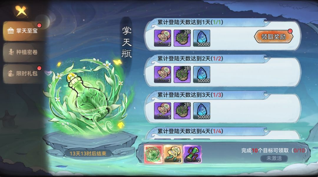 其次,参与主题活动“掌天至宝”的培植任务,累计登录天数、开垦仙圃数、累计收获灵植年份达到”种植密卷“目标可获得大量的灵植种子。
