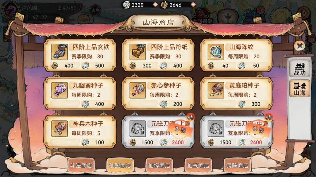 山海商店内出售的种子品类丰富,品质珍贵,且只能用山海战勋进行购买。其中售卖的神兵木种子,所结灵植【神兵果】可产出珍贵装备。