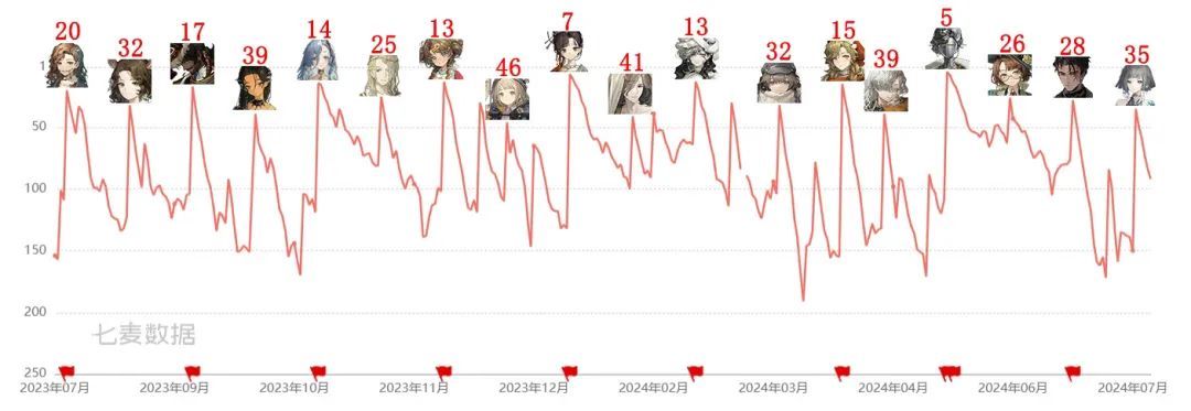 司辰们好呀!环状水星的卡池流水前5日已新鲜出炉。环状水星的流水峰值在下半流水中位列倒数,仅高于北方哨歌、葛天和爱兹拉。先让我们来看看近1年的游戏畅销榜排行吧,红色数字越小,说明排名越靠前,流水应越高。