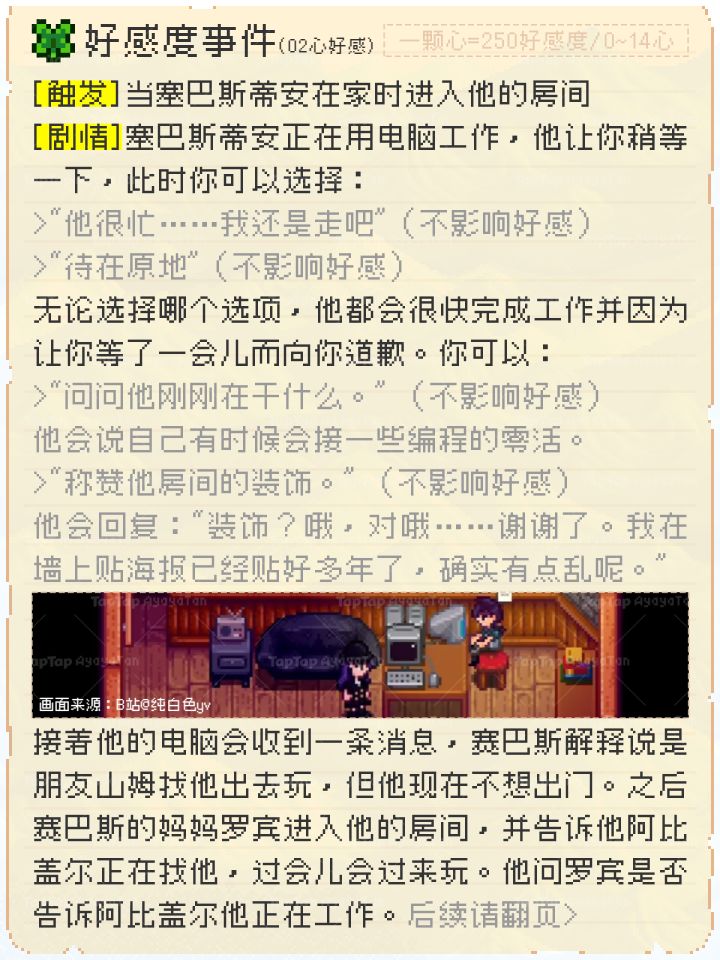 他会在自己的卧室里用电脑编程挣钱,在没认识玩家前他想要离开星露谷。但是在遇到你后他的想法也有了一些改变~