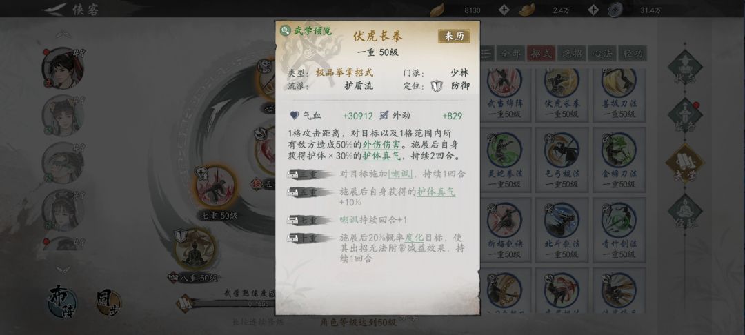 因为砍过一次韦陀和金刚的护盾数值,导致这两个技能的护盾量少之又少,但是我们需要的是护盾,有护盾就能反伤,所以这里最后一个技能推荐的也还是伏虎拳,有护盾就有伤害,后期也可以带慈悲棍,看自己橙色奥义数量,