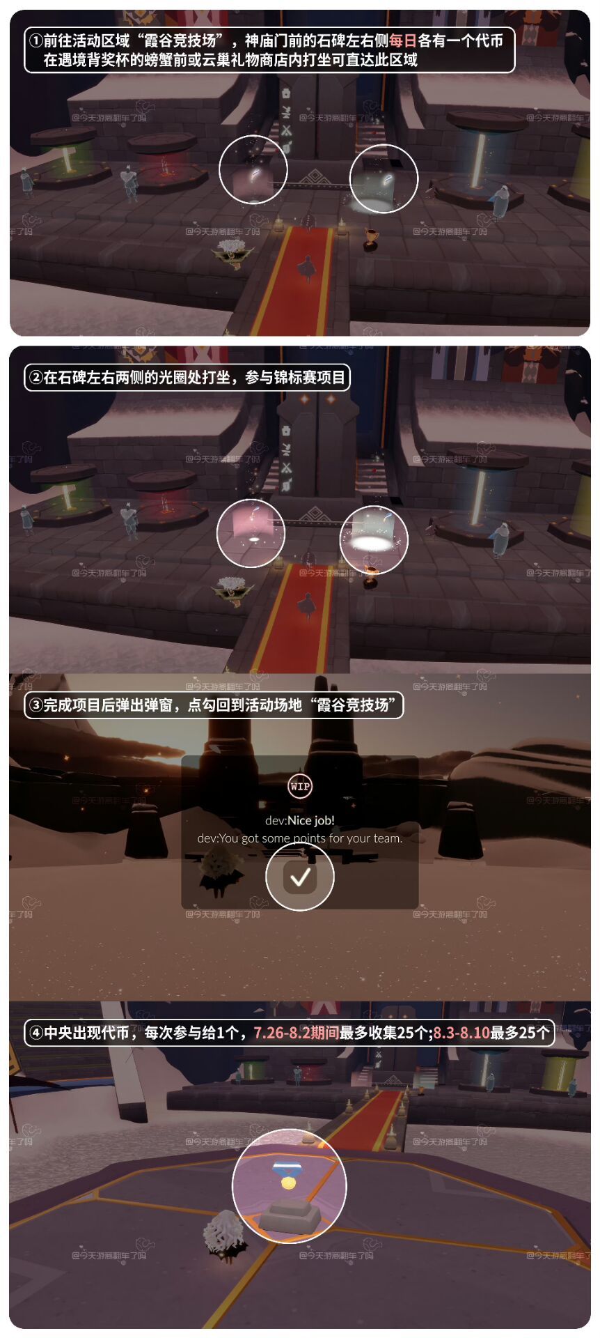 「参与锦标赛」进入霞谷竞技场,在神庙门前石碑左/右光圈处打坐参与并完成一场锦标赛