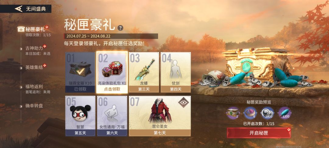 2.秘匣豪礼+秘匣奖励25抽(秘匣豪礼登录一天即领;秘匣奖励需要连续登录15天进行选择领取)!