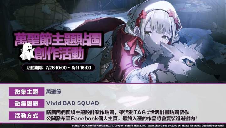 6|參與活動即視為同意將作品授權給遊戲官方使用,且官方享有修改、發布、製作成遊戲內虛擬物品等相關權利;玩家僅可將作品用於與《世界計畫 繽紛舞台!feat.初音未來》相關的非商業用途,但官方會保留作者的署名權,署名方式由官方根據實際情況而定。