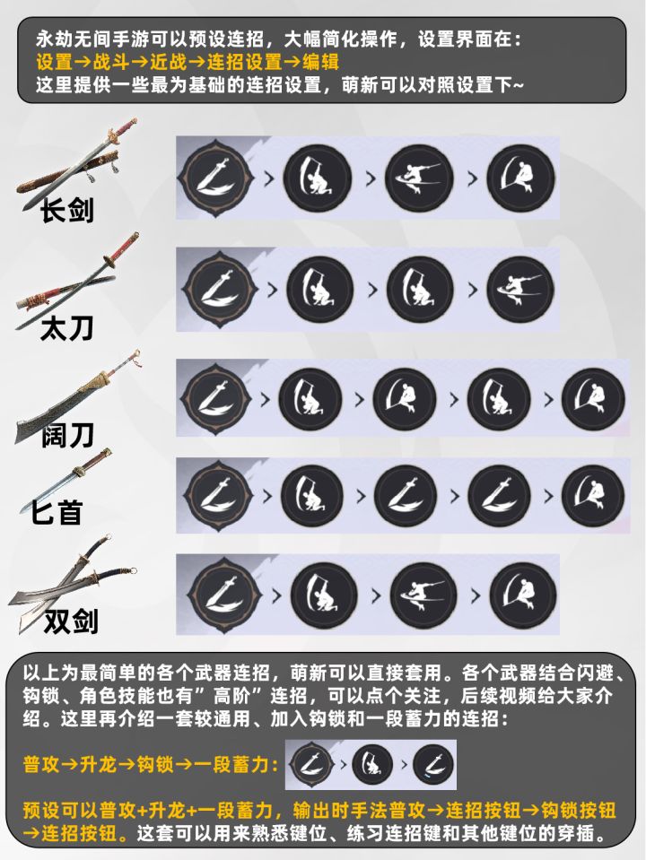 萌新不懂连招设置,可以按该图设置全武器的最基础连招~点个关注,后续会进行更多视频版连招教学~