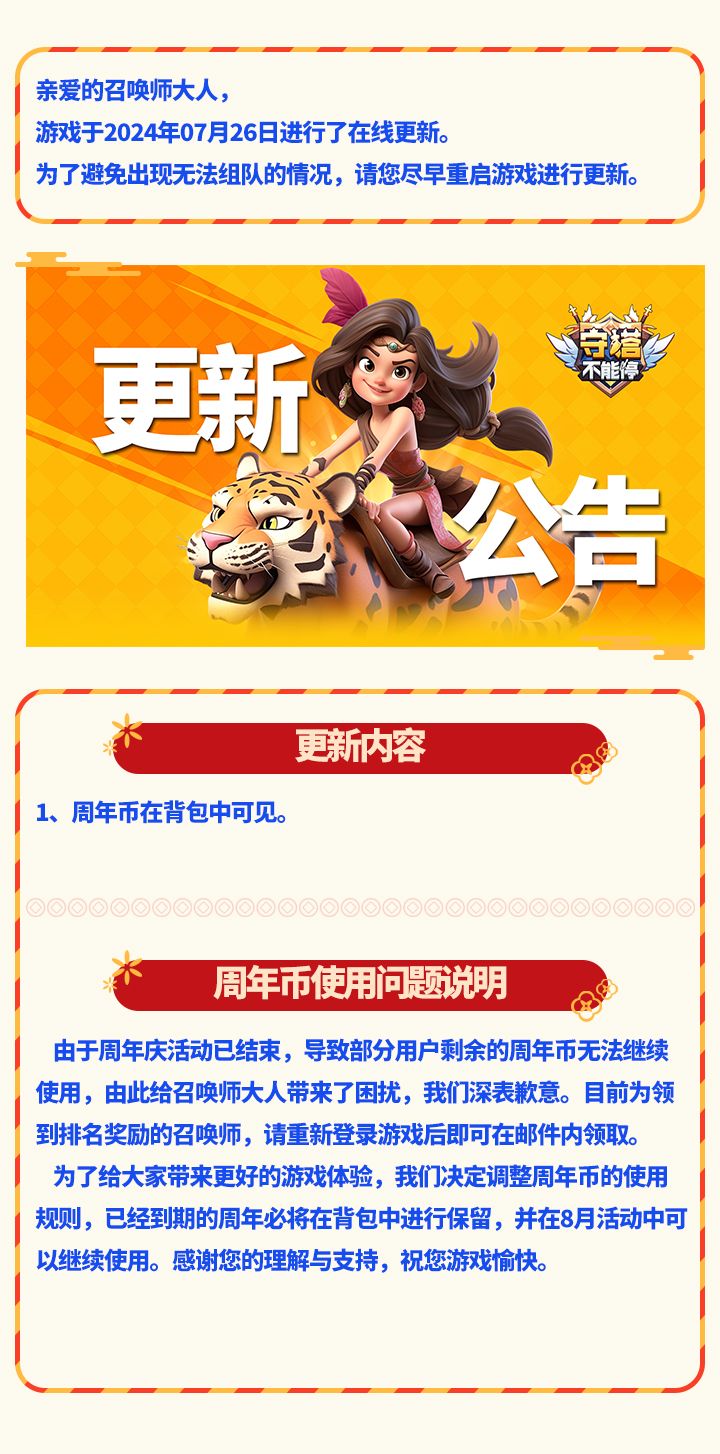 7月26日更新内容及周年币使用问题说明