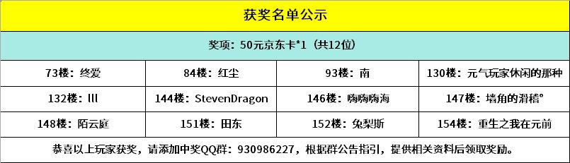 恭喜以下幸运的小骑士获得活动奖励,请中奖的小骑士添加获奖群:930986227,请加获奖群后,登记相关获奖信息,超过15个自然日未进群未登记视为放弃奖励~
