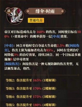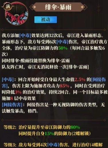 当累计挂毒达到24层后觉醒为暴雨状态,该状态下帝江拥有群体治疗能力,攻击力防御力都有提升,同时二技能酸雨被动变成主动释放技能。需要注意的是,雷雨状态帝江的治疗量与防御力和治疗效果有关,且单回合最多治疗6次,治疗的触发需要对方毒伤结算达到一定次数。