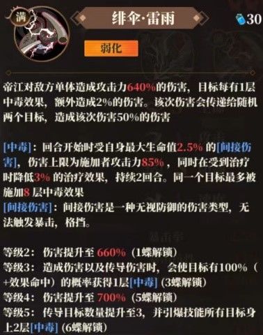 酸雨状态下敌方全体中毒层数越多帝江获得的免伤越高,该免伤效果直接伤害与间接伤害都可以减免,变身雷雨状态后失去免伤效果且后续无法再次获得。