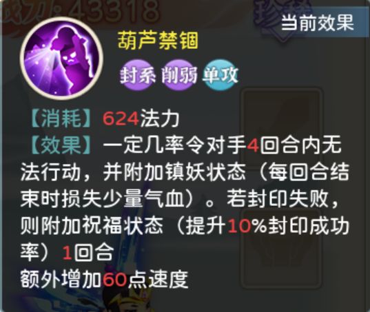 七娃的核心技能——葫芦禁锢,概率直接封印敌方单体4回合,在面对驱散能力弱的对手时,七娃可以通过连续封印逐一封禁多个单位的行动,在对抗强力且有驱散能力的boss时,七娃也可以通过抢速度在回合前封印boss,即使boss在回合后驱散了封印,回合中也不能释放技能对我方造成威胁。