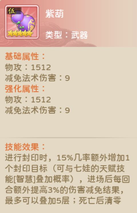 为七娃量身定制的五星武器,增加物攻能稍微增加葫芦镇妖的伤害,减法伤和被动减伤能够降低七娃被秒的概率,更为关键的是能与天赋叠加的多封一个的概率,让七娃有更高的概率一次封两个。
