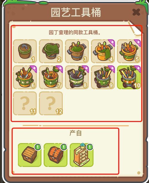 上方图示的便是点击信息后显示的面板信息,上半部分说明了“园艺工具桶”一共有12级,11、12级未显示的图标表示暂未合成喔;