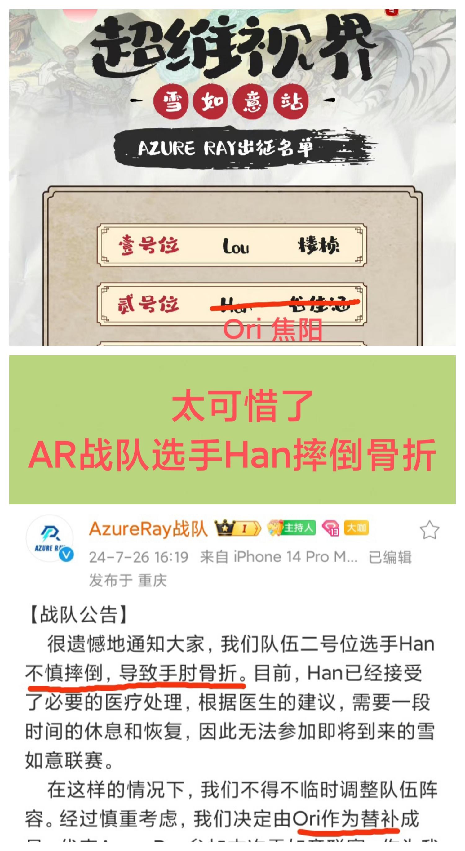队伍二号位选手Han摔倒骨折,无法参加即将到来的雪如意联赛❗❗❗