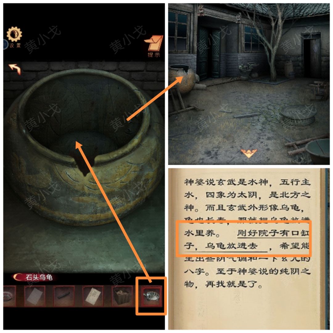 1.(院子)点击水缸,根据书上的线索,放入【石头乌龟】,缸里装满水