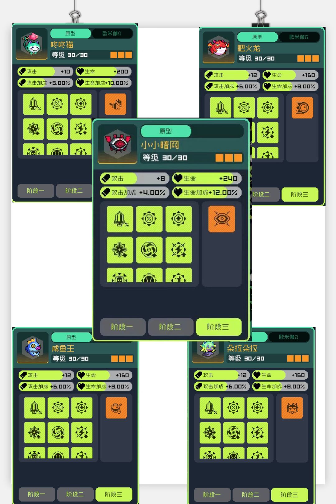 注意:肥火龙、暗网、朵拉、咸鱼王(吹雪技能斩击吃不到咸鱼王加成,只能飞起来,咸鱼王的子弹和易伤效果必须要开枪才能触发)技能可以升6级,咚咚猫技能升5级/6级均可,6级闪电链会有轻微吞伤,但是不明显。