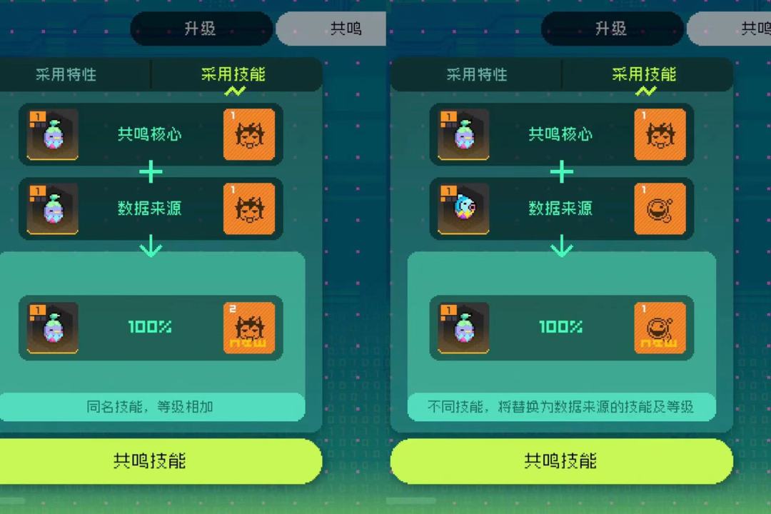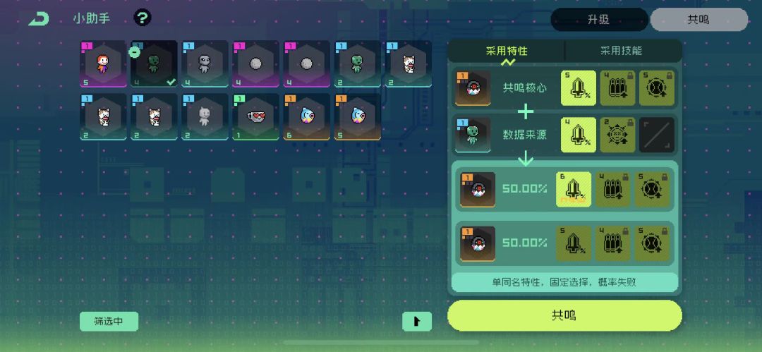 注意:一、50%概率可以赌一手,低于50%不建议赌,想要稳妥升级的话,就是可以先把副宠多次共鸣,直到副宠的特性等级跟原有宠物特性等级相同即可!